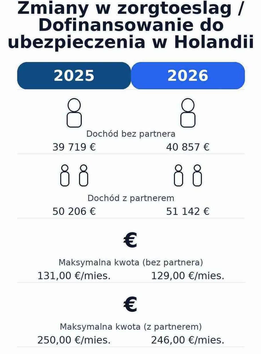 W 2026 roku rosną progi dochodu dla zorgtoeslag (40 857 € bez partnera, 51 142 € z partnerem), ale jednocześnie maksymalne kwoty dodatku są nieco niższe niż w 2025 r